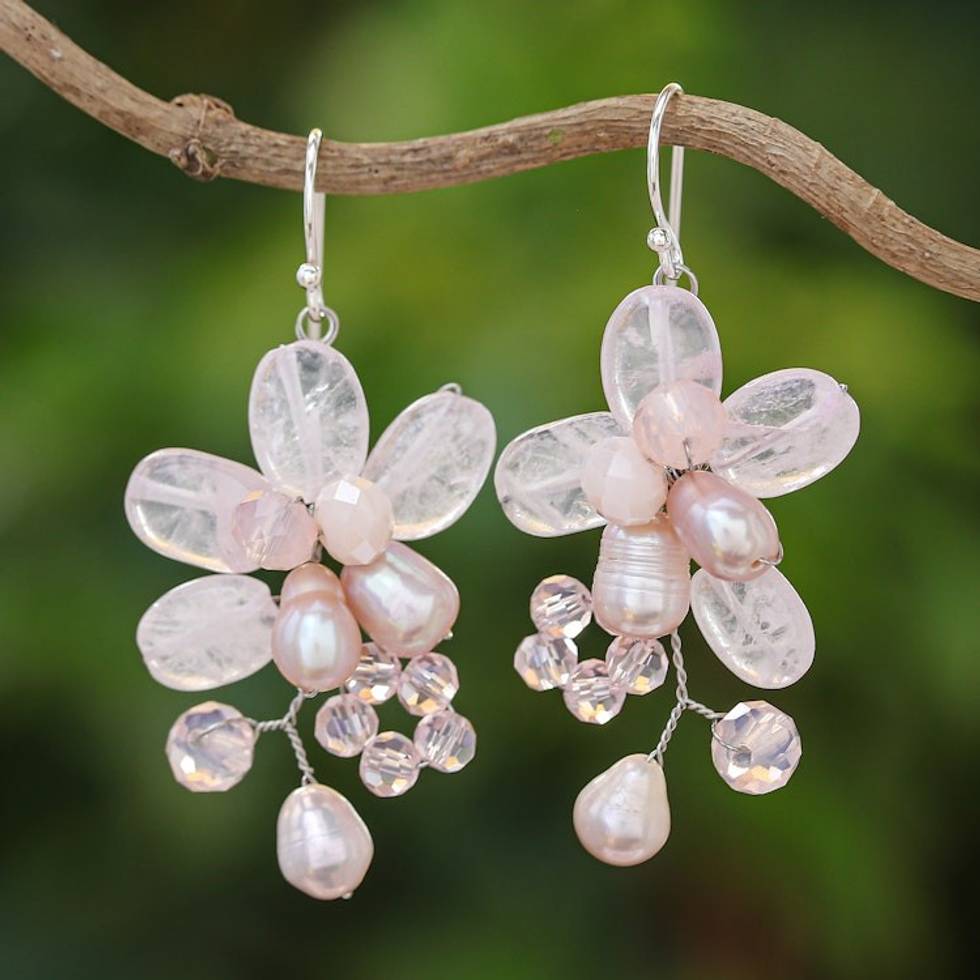 Rose Quartz and Cultured Pearl Dangle Earrings from Thailand 'Elegant Flora' Item ID: 2669925882