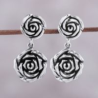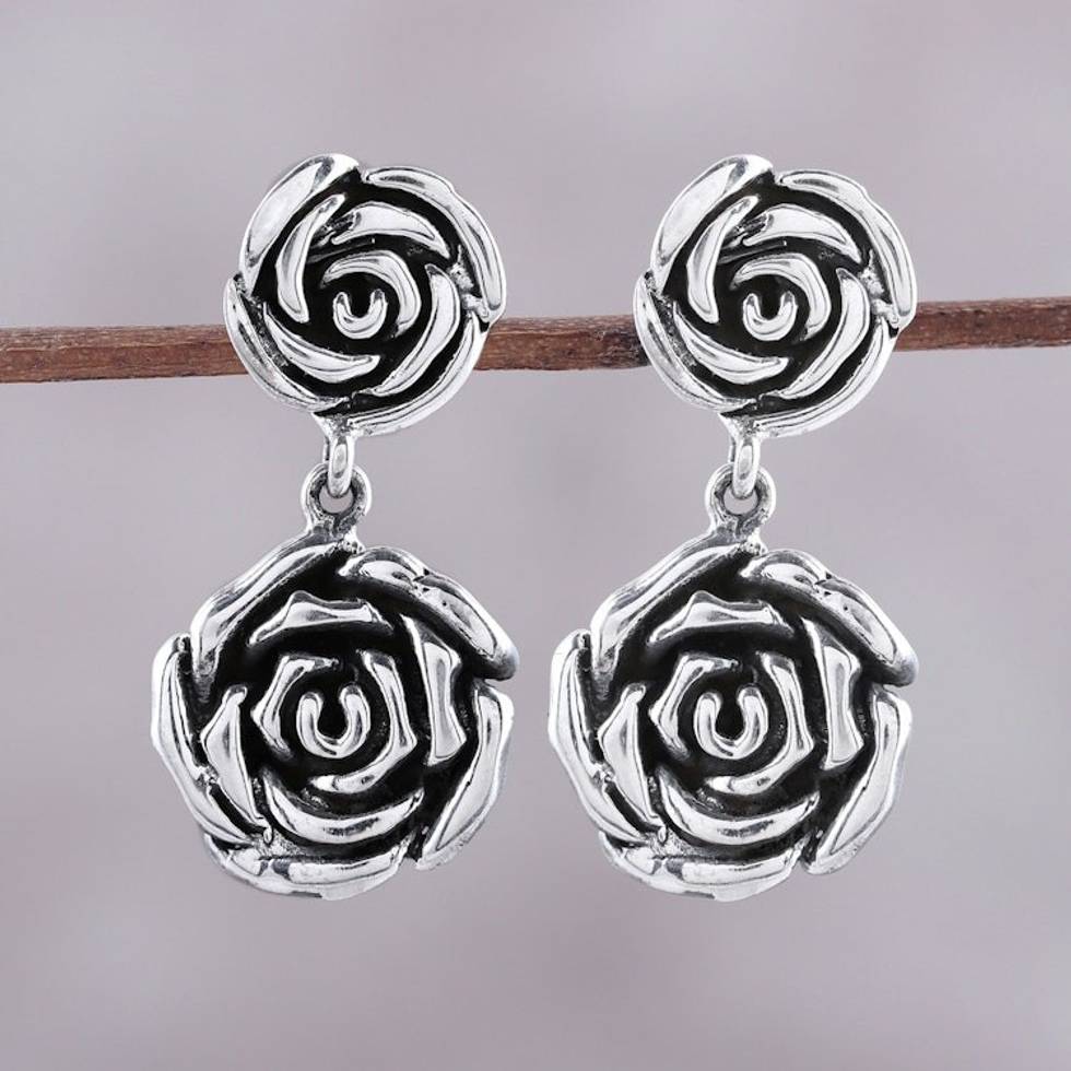 Rose-Shaped Sterling Silver Dangle Earrings from India 'Adorable Beauty' Item ID: 2671792549