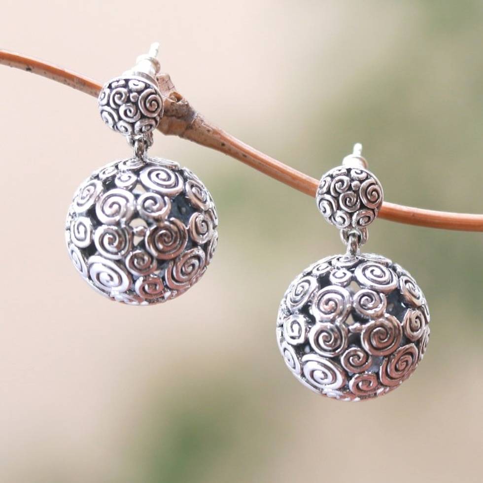 Round Curl Pattern Sterling Silver Dangle Earrings from Bali 'Buddha's Orbs' Item ID: 2671737003