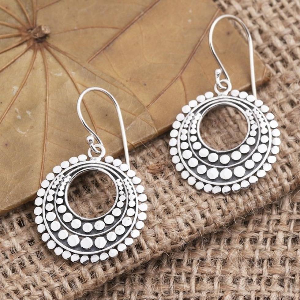 "Resembling heavenly bodies in orbit, tiny polished dots of silver follow a circular path. Ketut Adimasta in Bali designs these pretty earrings from sterling silver with contrasting polished and oxidized finishes."