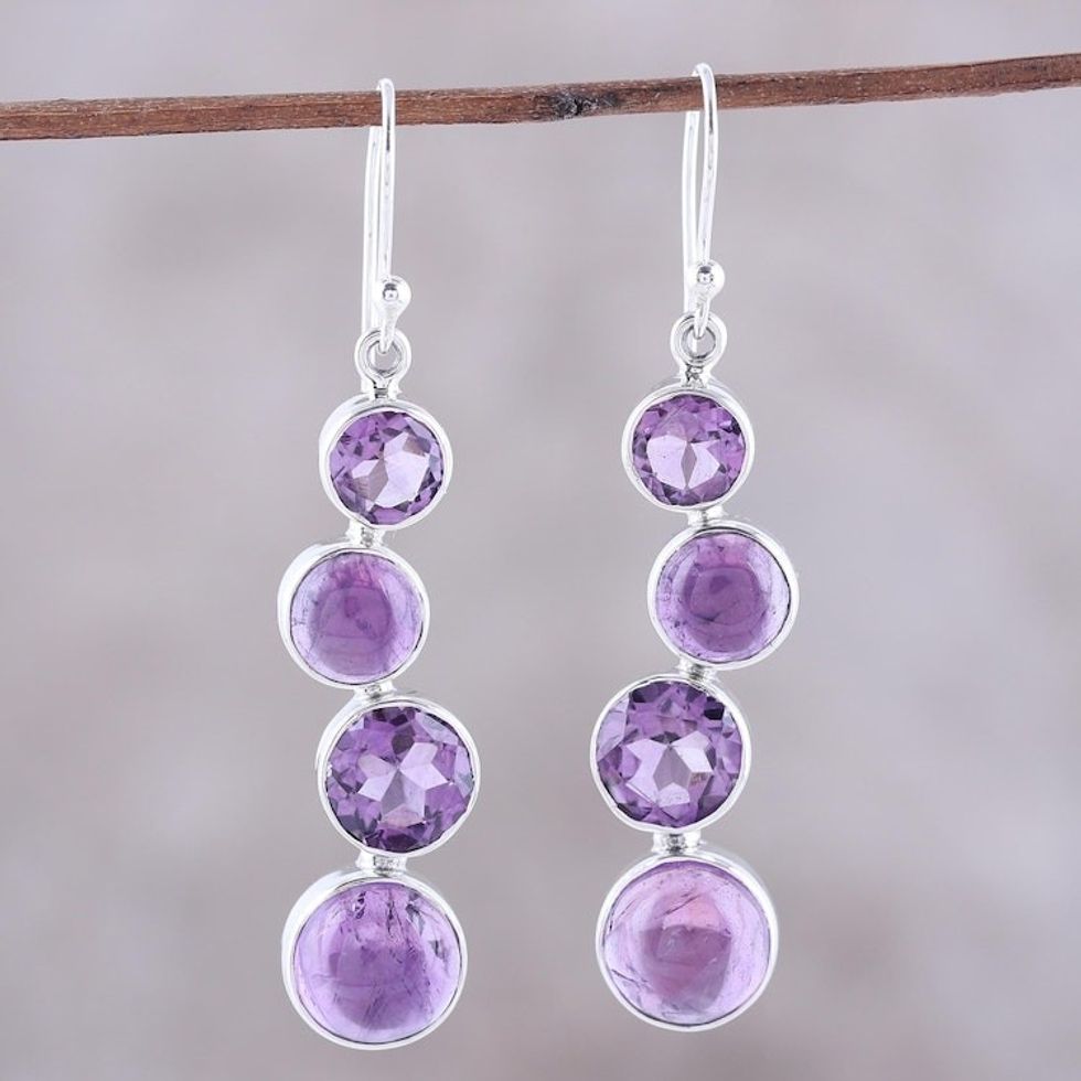 Round Faceted Amethyst and Sterling Silver Dangle Earrings 'Purple Raindrops' Item ID: 2671792083