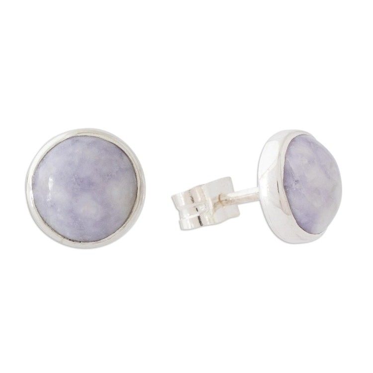 "These dainty round stud earrings are designed and crafted by Carolina Quiroa. Set in polished sterling silver, natural Guatemalan pale lilac shade is subtle and lovely."