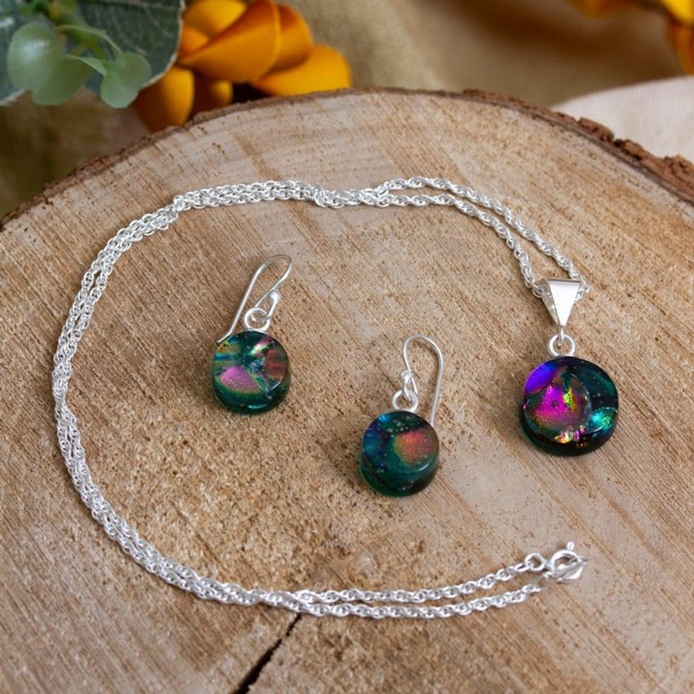 Round Viridian Dichroic Art Glass Jewelry Set from Mexico 'Viridian World' Item ID: 2671807808