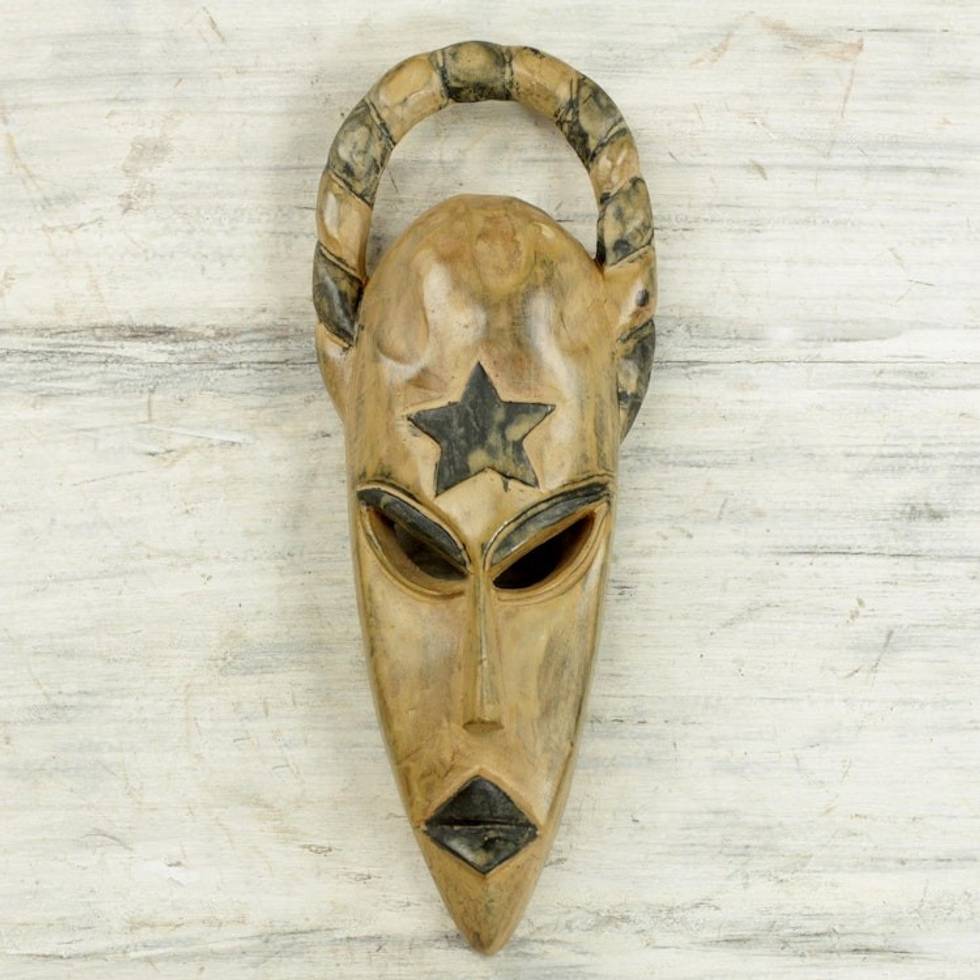 "This original mask design from Ghana's Kwasi George exudes rustic appeal. The artisan carves the mask from native sese wood, including a rope-like headdress and a star on the forehead. The mask is painted by hand in shades of cream and black, and local clay is used to lend the mask an aged appearance."
