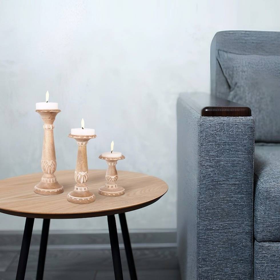 "Handcrafted in India by artisans who practice traditional carpentry and woodcarving, this elegant set of 3 mangowood candle holders adds a festive look to any decor style. Each stand is 3' wide to fit most pillar candles and includes felt pads on the bottom to avoid scratching surfaces."