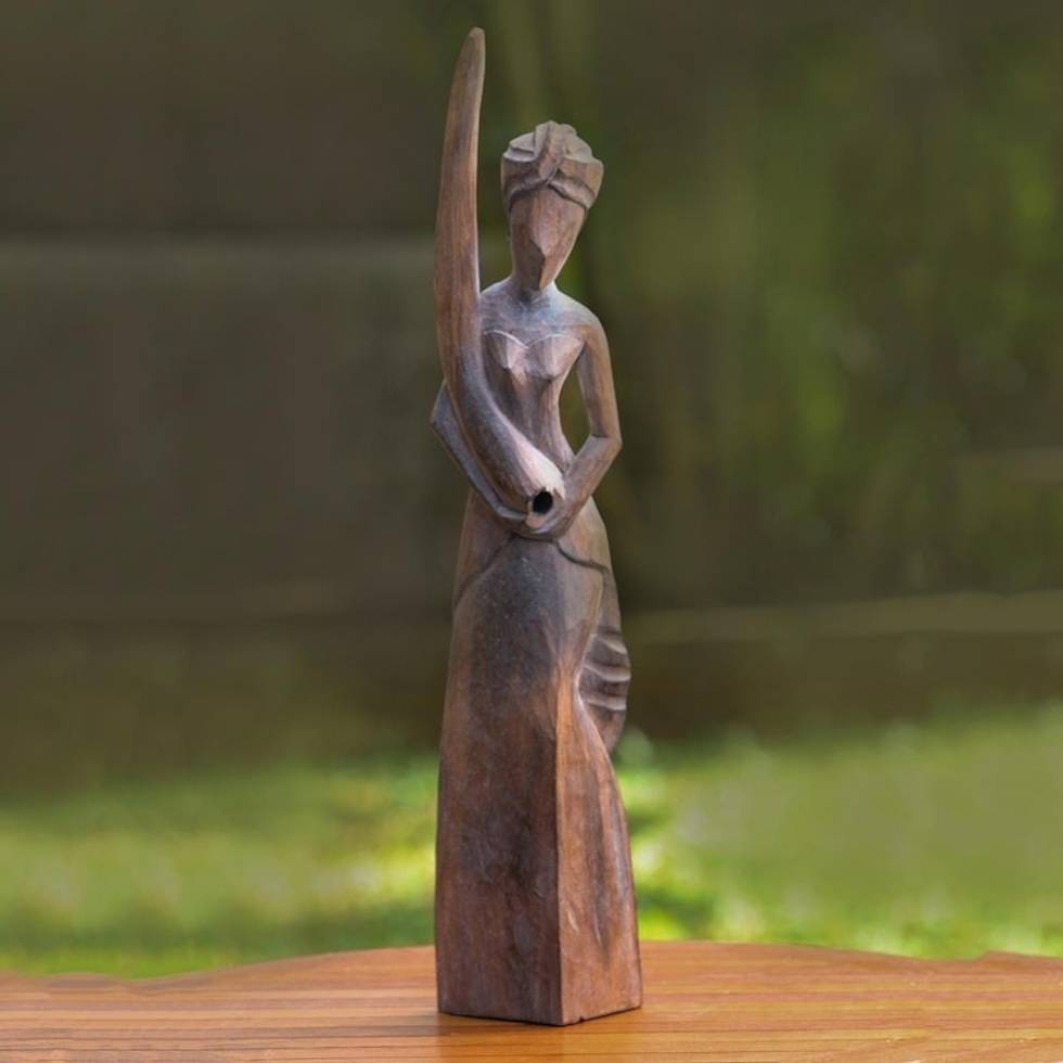 "In this appealingly minimalist statuette, artisan Made Pastika has depicted a Balinese woman in traditional garb, carrying a didgeridoo. The didgeridoo is a wind instrument developed by indigenous Australians perhaps over 1,000 years ago. Pastika gives a slightly whitewashed finish to the statuette for an aged patina."