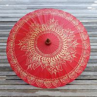 "Passionate red and golden Thai motifs adorn this saa paper parasol. By Nikom, it makes use of saa paper and is further embellished with bamboo spines and hand-painted with intricate designs. This parasol features designs rooted in the elegance of Thai architecture."