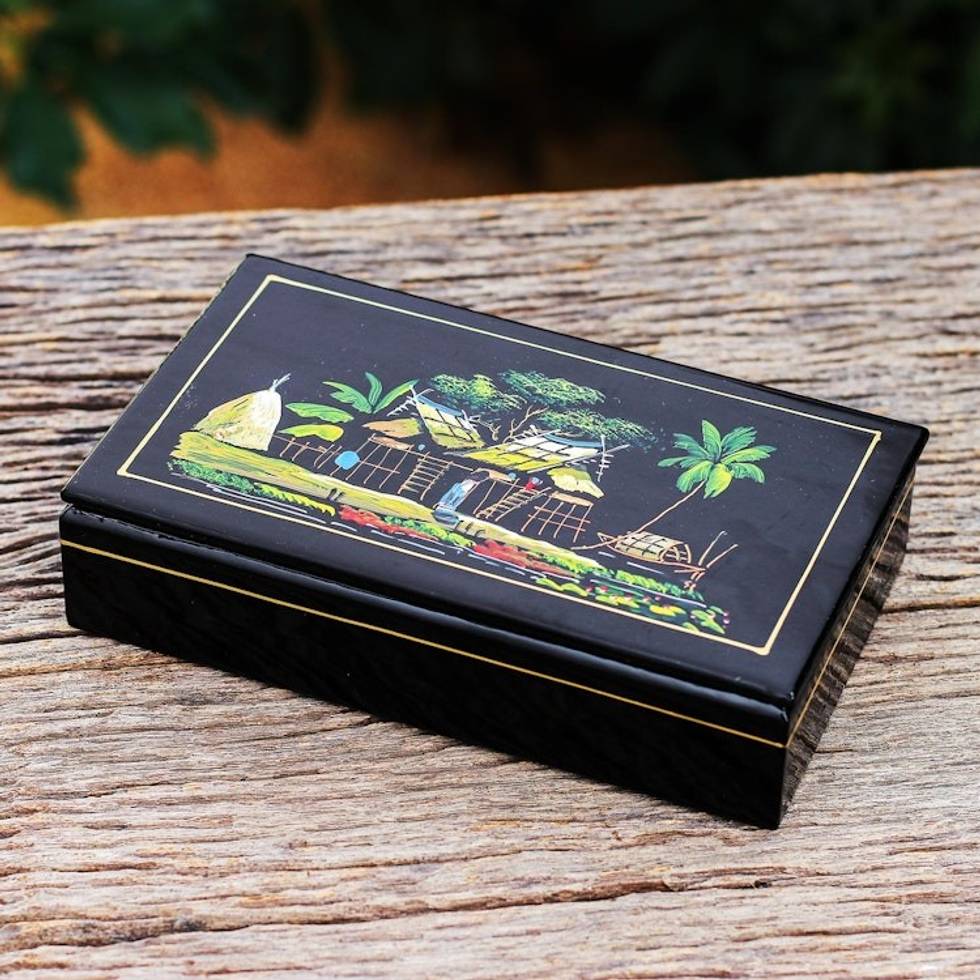Scenic Lacquerware Wood Box from Thailand 'Countryside Life' Item ID: 2671800083