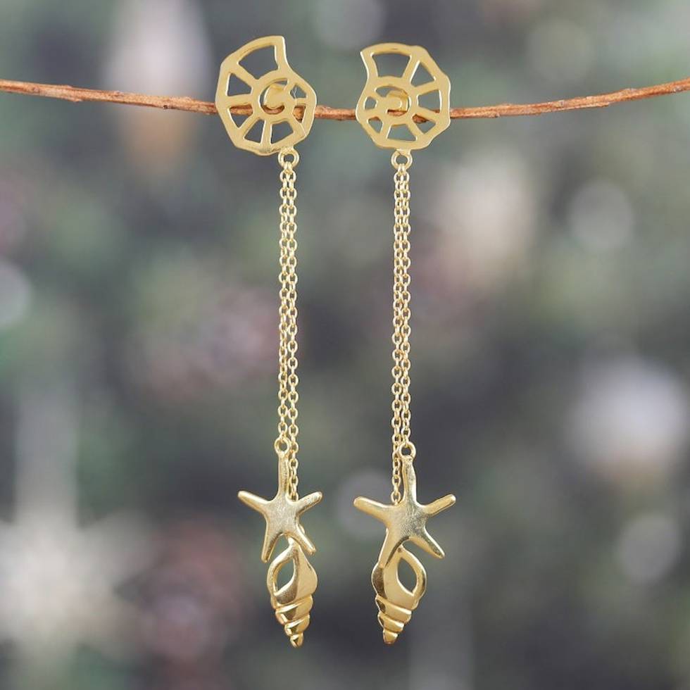 Sea-Life-Themed Brass Statement Dangle Earrings from India 'Underwater Glory' Item ID: 2671788550