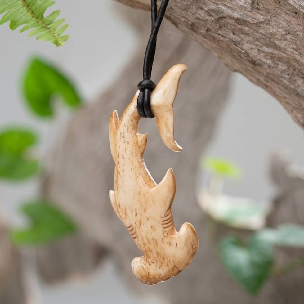 Sea Life-Themed Carved Black Leather Cord Pendant Necklace 'Hammerhead Shark' Item ID: 2671765199