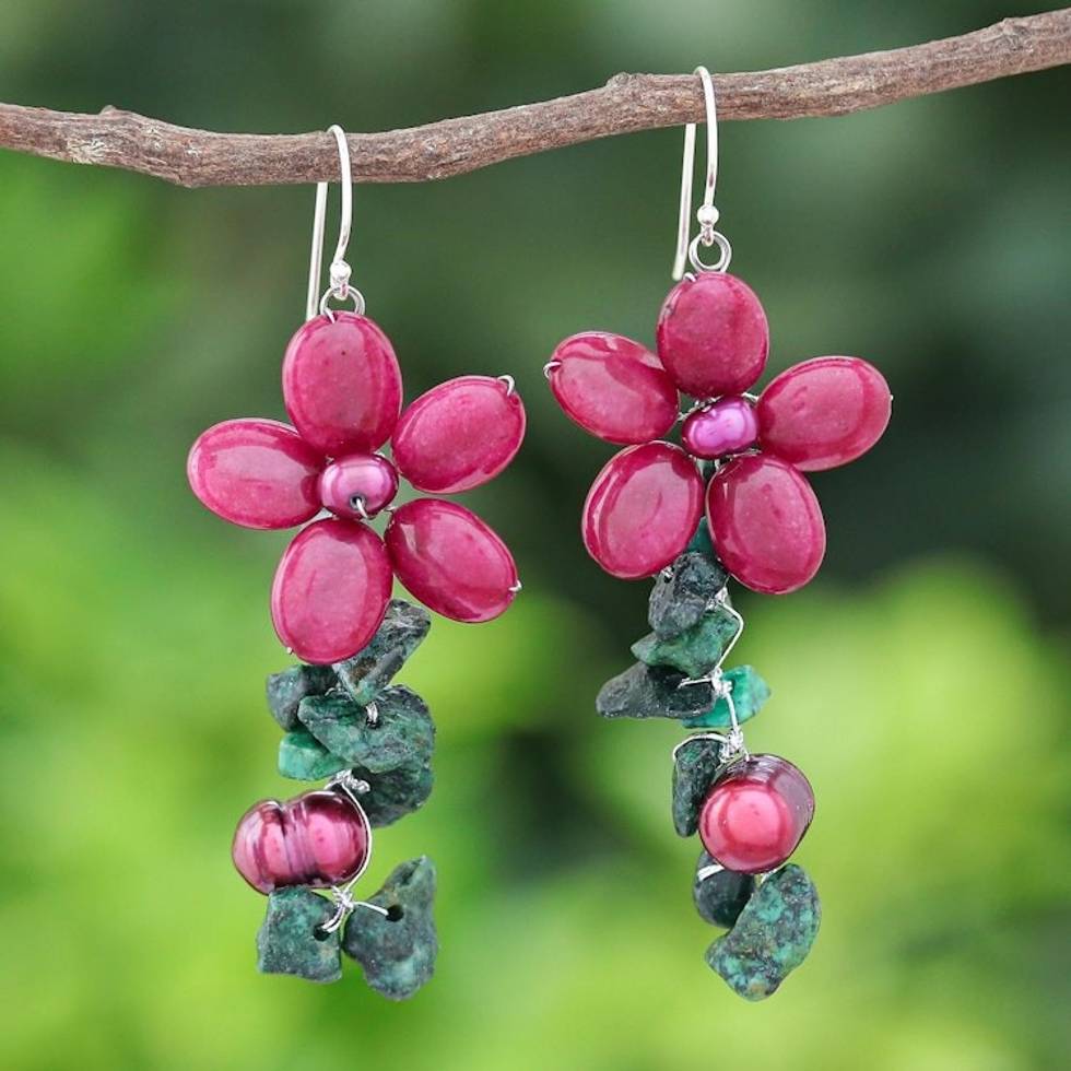 Serpentine and Cultured Pearl Floral Earrings 'Petal Passion in Fuchsia' Item ID: 2671800353