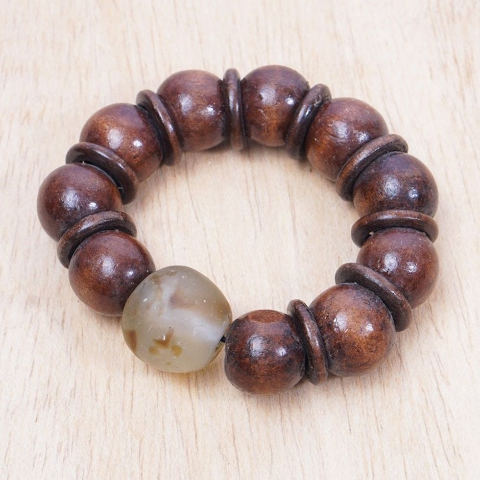 Sese Wood and Clear Recycled Glass Beaded Stretch Bracelet 'Ghana's Smile' Item ID: 2671804704