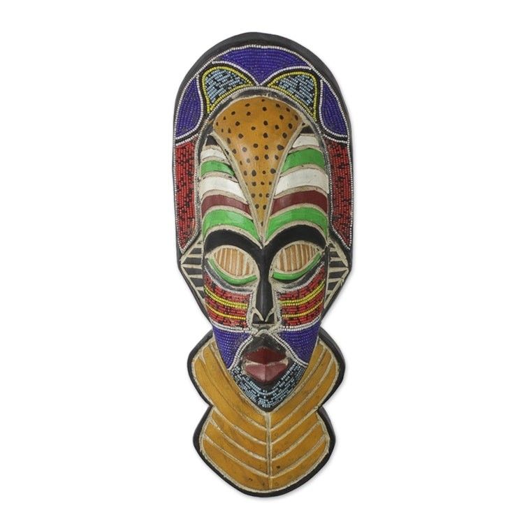 Sese Wood and Recycled Glass Beaded Wall Mask from Ghana 'Sinethemba' Item ID: 2671803643