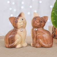 Set of 2 Hand-Carved Cat Raintree Wood Figurines with Bells 'Melodic Meows' Item ID: 2671640884