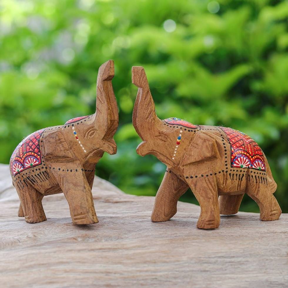 Set of 2 Hand-Carved Wood Elephant Sculptures with Red Tone 'The Vibrant Prosperity' Item ID: 2671798235