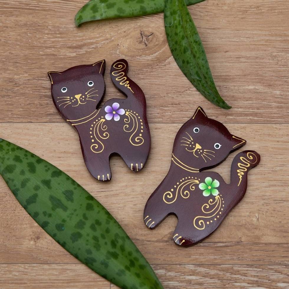 Set of 2 Hand-Painted Floral Cat-Shaped Wood Magnets 'Paradisial Kittens' Item ID: 2671764074