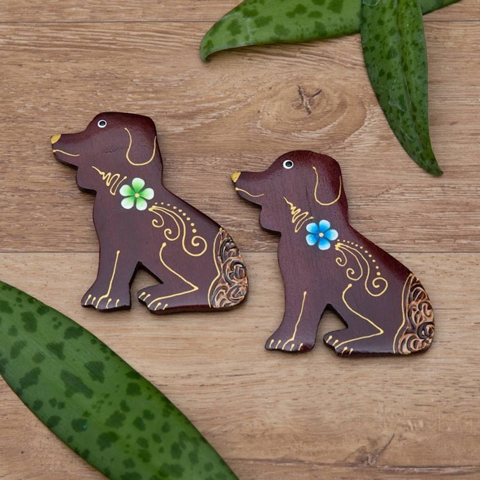 Set of 2 Hand-Painted Floral Dog-Shaped Wood Magnets 'Paradisial Puppies' Item ID: 2671764480