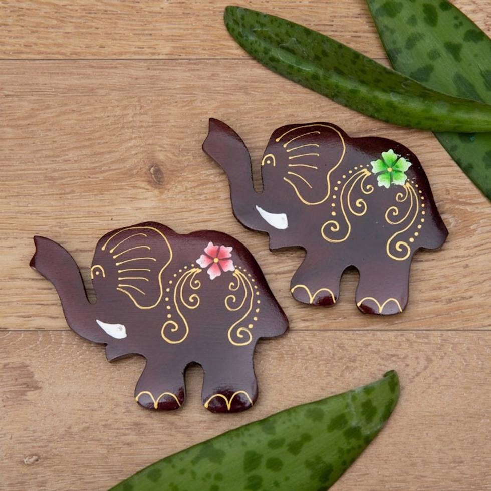 Set of 2 Hand-Painted Floral Elephant-Shaped Wood Magnets 'Paradisial Elephants' Item ID: 2671764936