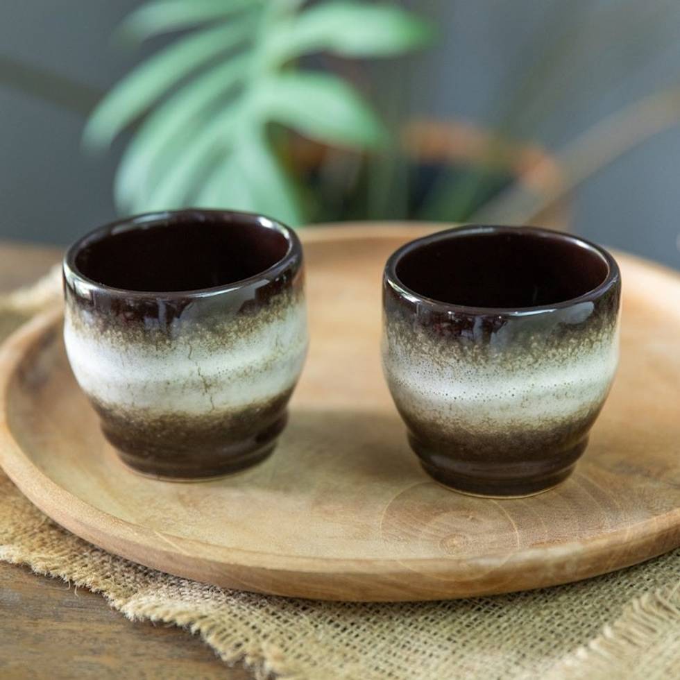 Set of 2 Handcrafted Brown and White Ceramic Cups from Bali 'Serene Flavors' Item ID: 2671763086