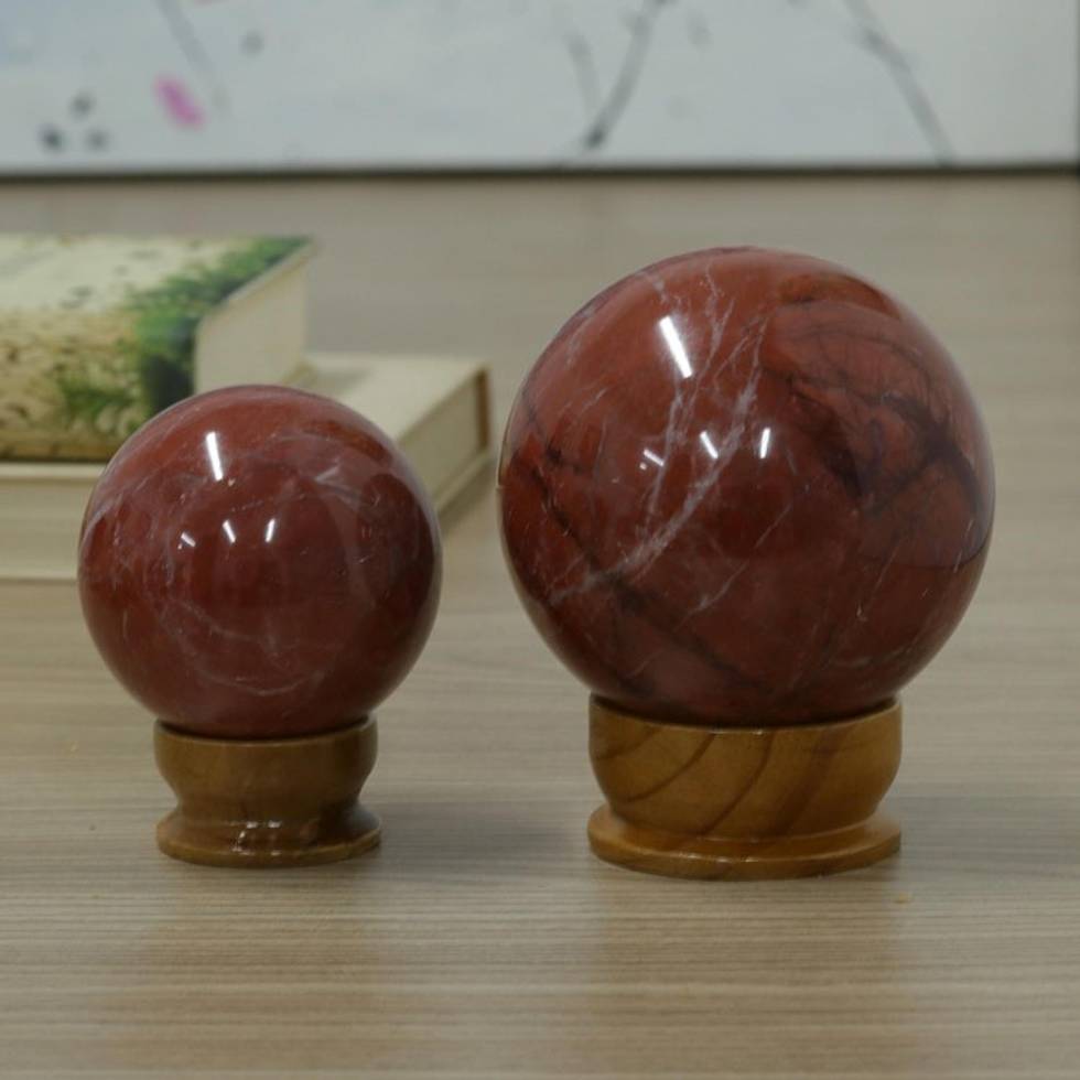 Set of 2 Polished Jasper Sculptures with Cedar Wood Stand 'Calm Orbs' Item ID: 2669890356