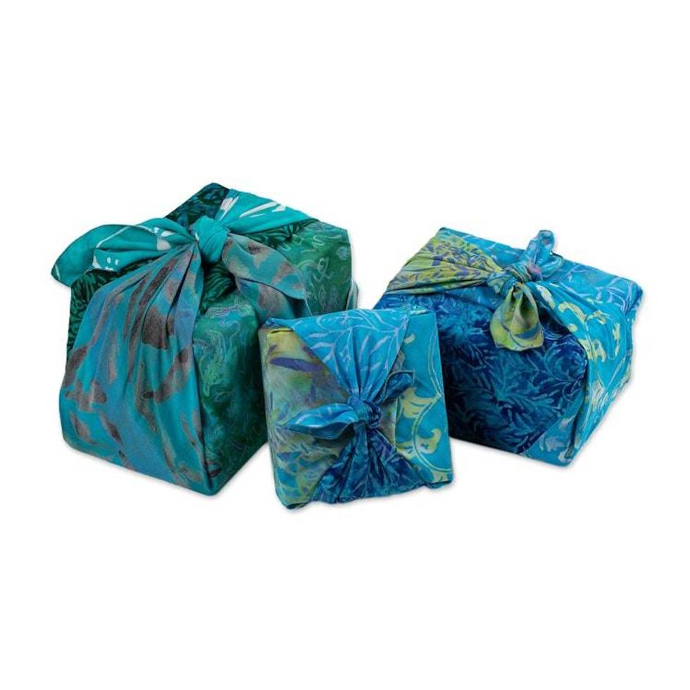 Set of 3 Blue and Green Batik Furoshiki-Style Gift Wraps 'Oceanic Earth' Item ID: 2676656955