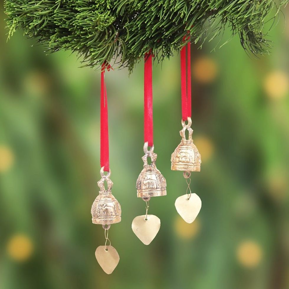 Set of 3 Brass Bell Ornaments with Elephants and Red Ribbons 'Elephant Chant' Item ID: 2669897536