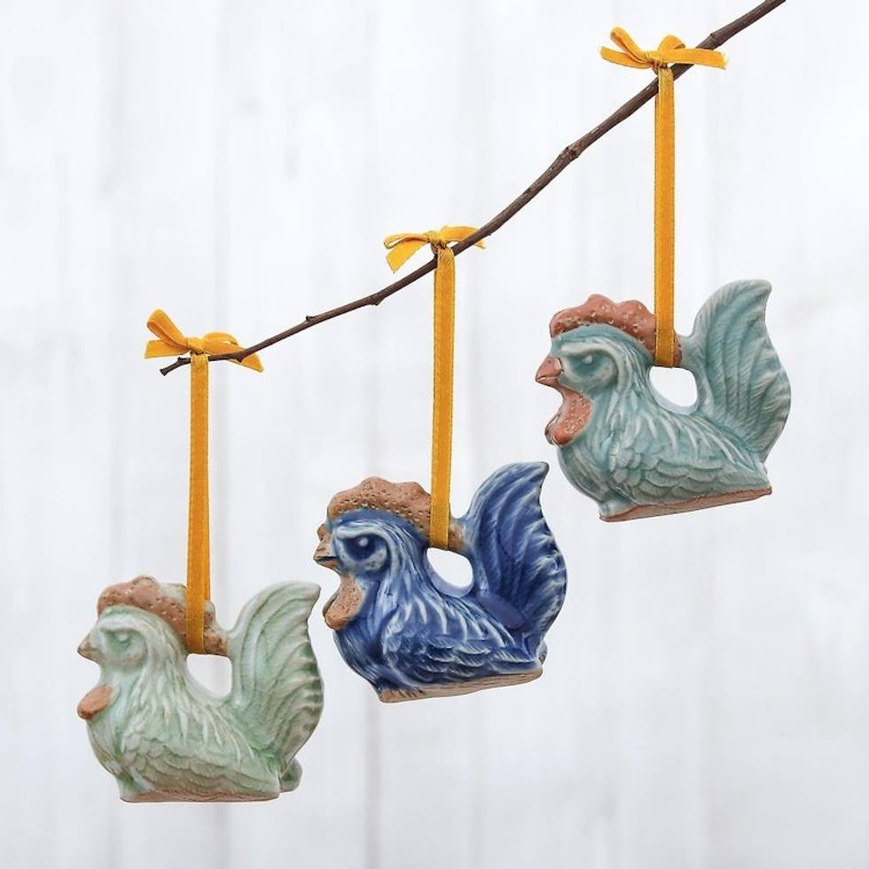 Set of 3 Chicken Ornaments in Celadon Ceramic 'Happy Hens' Item ID: 2671798527
