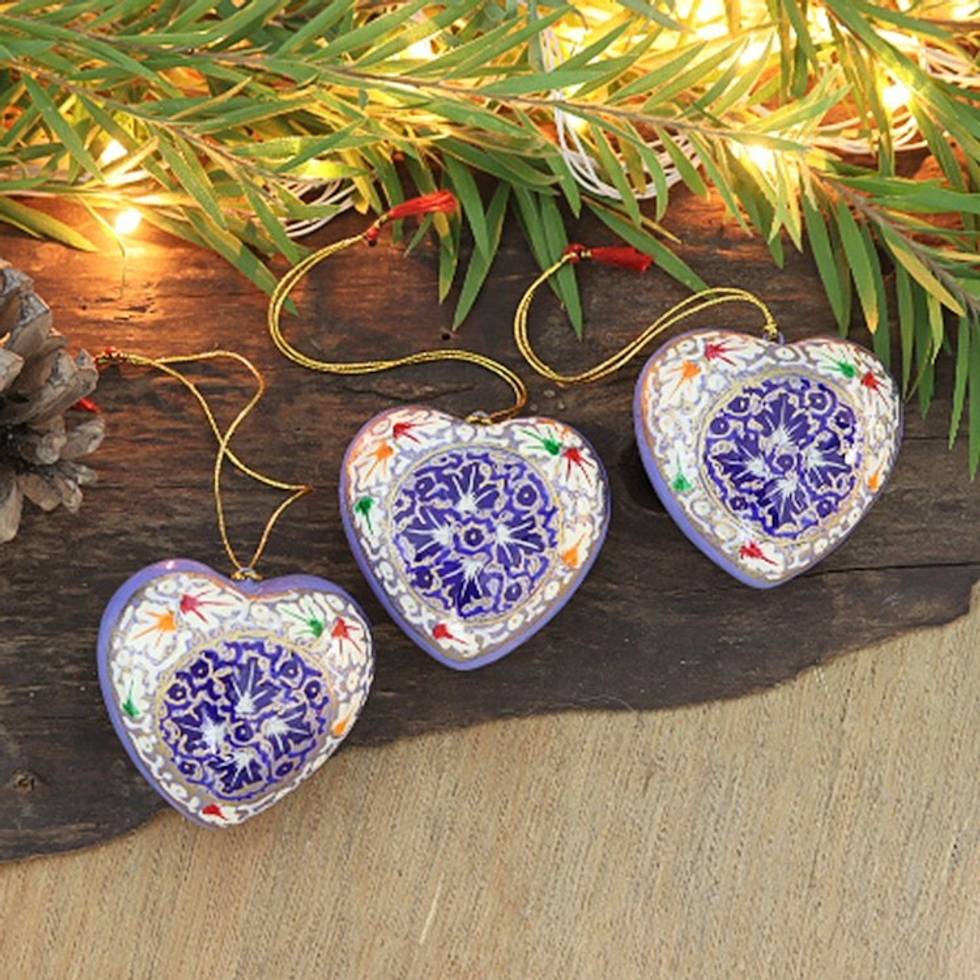 Set of 3 Papier Mache Heart Ornaments Hand-Painted in India 'Blue Romance' Item ID: 2671786529