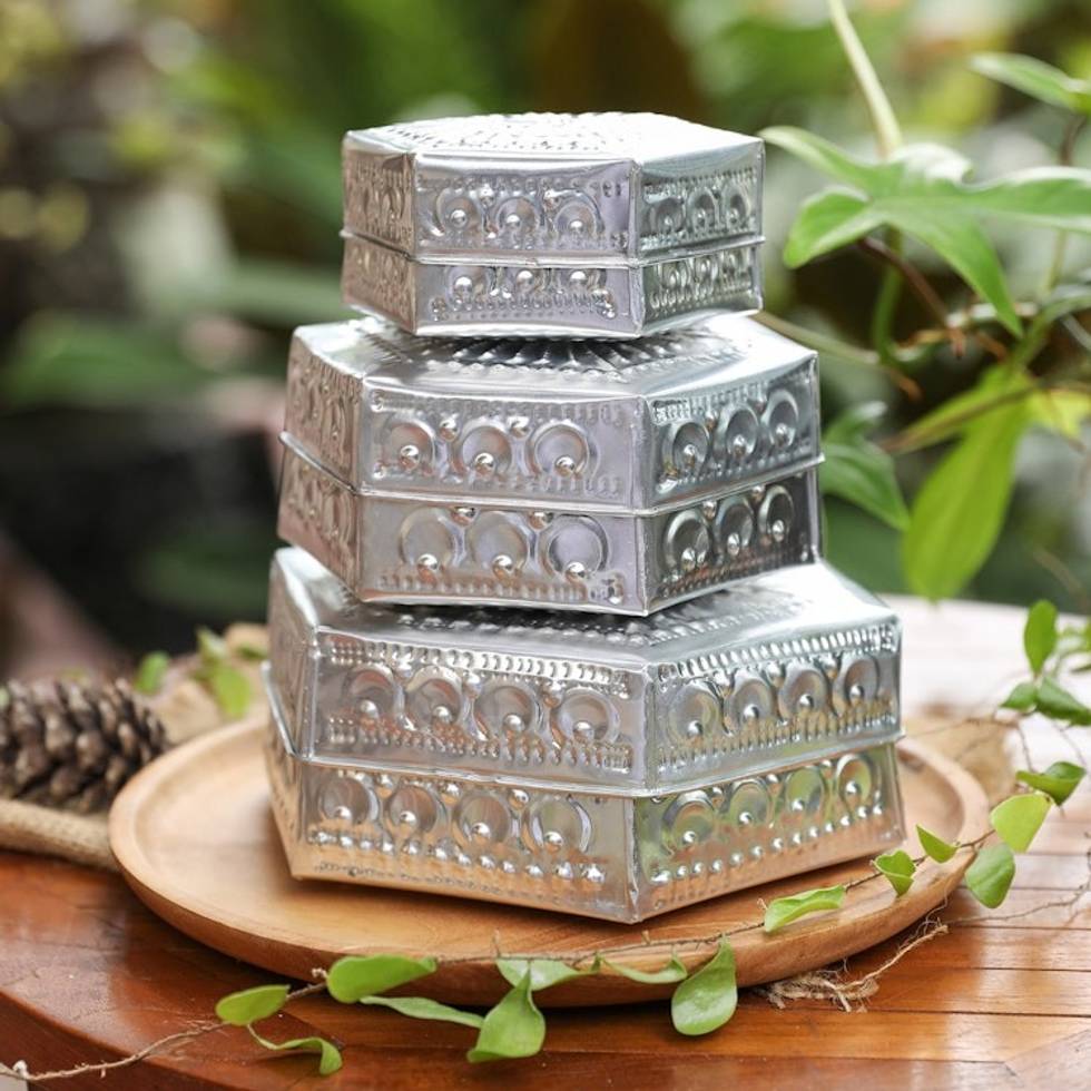 Set of 3 Repousse Hexagonal Aluminum Decorative Boxes 'Hexagonal Palace' Item ID: 2671764526
