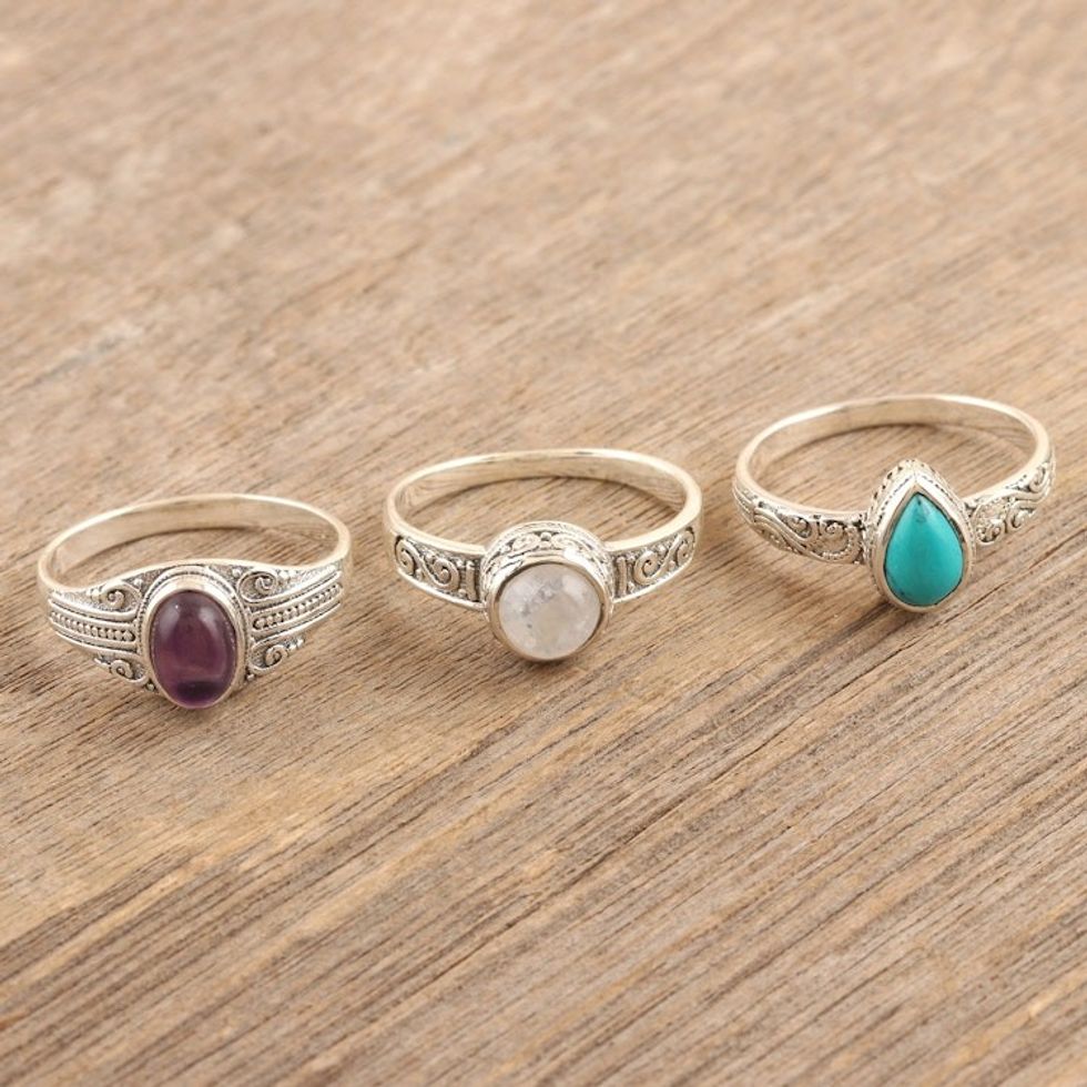 Set of 3 Sterling Silver Cocktail Rings with Cabochons 'Triple Harmony' Item ID: 2669943760