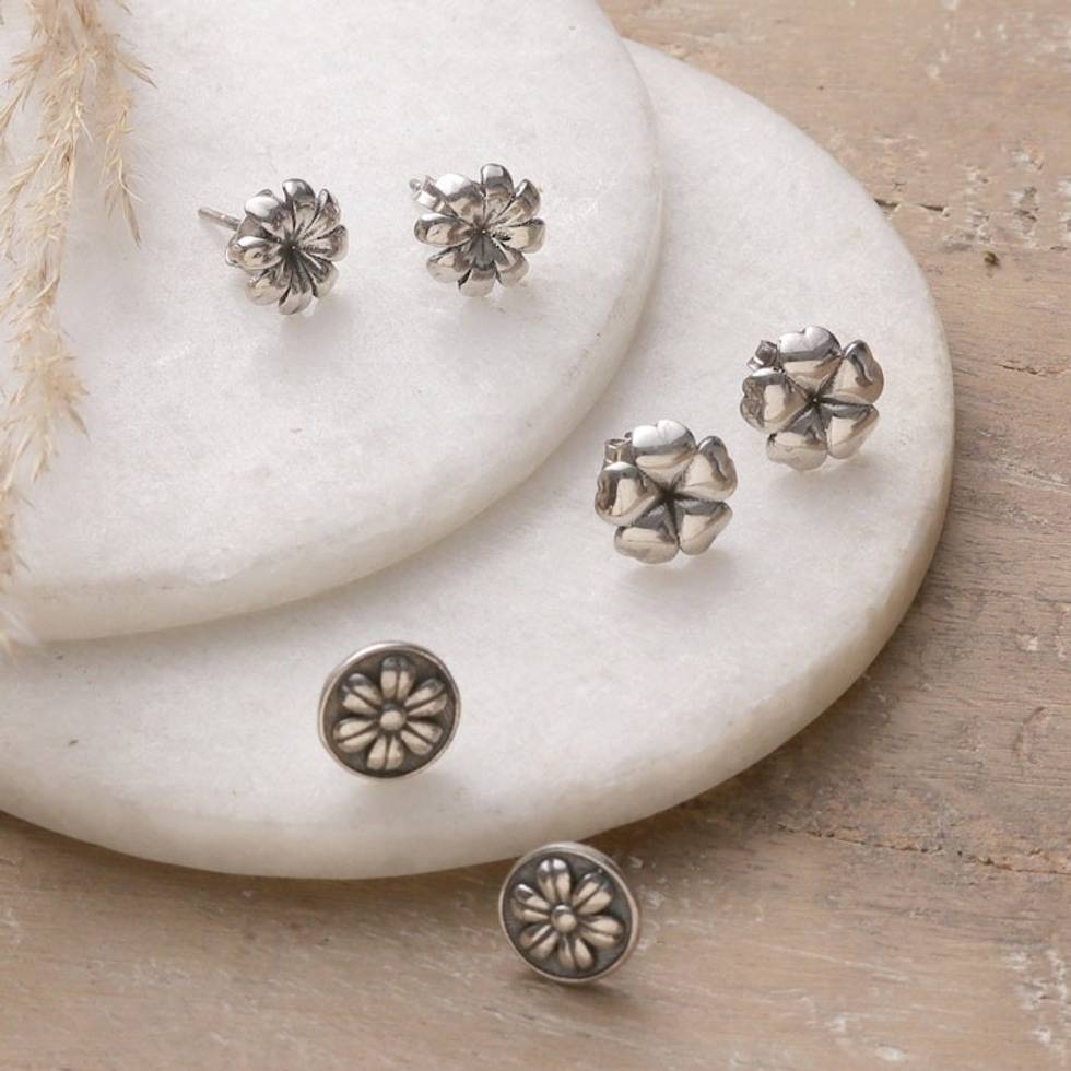 Set of 3 Sterling Silver Stud Earrings with Floral Motifs 'Floral Harmony' Item ID: 2671781480