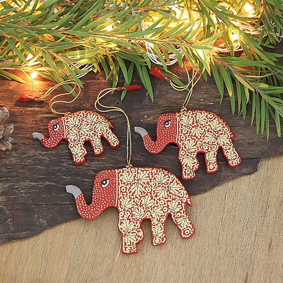 Set of 3 Wood Elephant Ornaments Hand-Painted in Red Hues 'Kashmir Elephants' Item ID: 2669892205