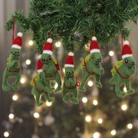 "Elevate your holiday spirit with these enchanting Christmas tree ornaments by Pramod Panwar. Handcrafted from festive green wool felt and adorned with vibrant crocheted caps in red and white, these six delightful dinosaurs bring joy to your home, each carrying a miniature pine tree on their back."
