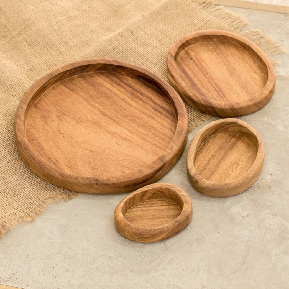 Set of 4 Hand-Carved Conacaste Wood Snack Plates 'Delicacy Family' Item ID: 2671769642