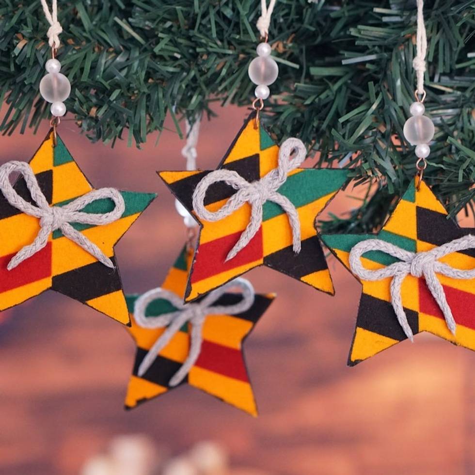 "Let the cheerful vibe of these star ornaments take over your holiday decor. Handcrafted by Ghana's K. Baka, this set of four accessories comes in a palette of yellow, green, red and black hues. On top of that, each has recycled glass and plastic beads, reducing pollution and adding a lovely touch to the items."