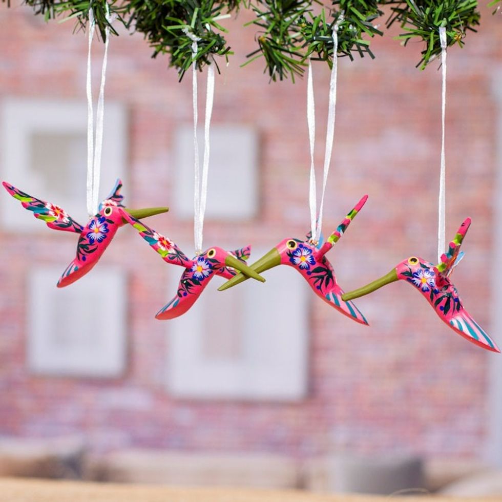 Set of 4 Handcrafted Copal Wood Bird Ornaments in Carmine 'Carmine Flutter' Item ID: 2671807376