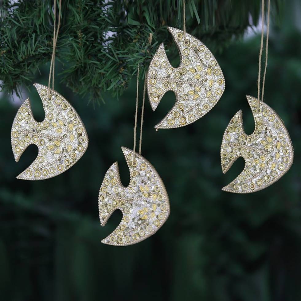 Set of 4 Handmade Beaded Wood Fish Ornaments with Jute Cords 'Shiny Ocean' Item ID: 2671787007