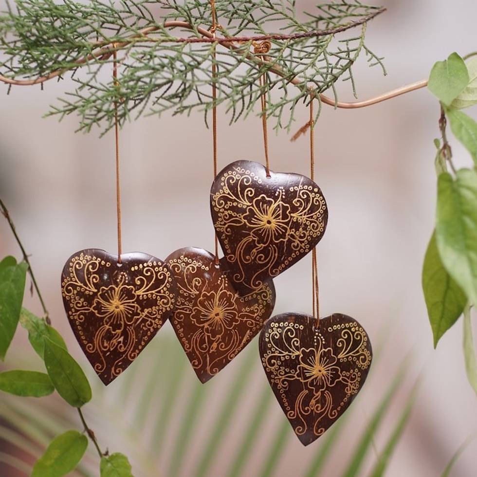 Set of 4 Handmade Brown Coconut Shell Heart Ornaments 'With Our Hearts' Item ID: 2671479346