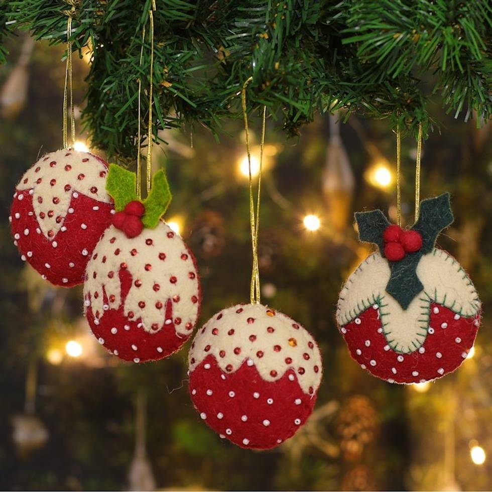 Set of 4 Strawberry-Themed Red and White Wool Felt Ornaments 'Christmas Strawberries' Item ID: 2671782032