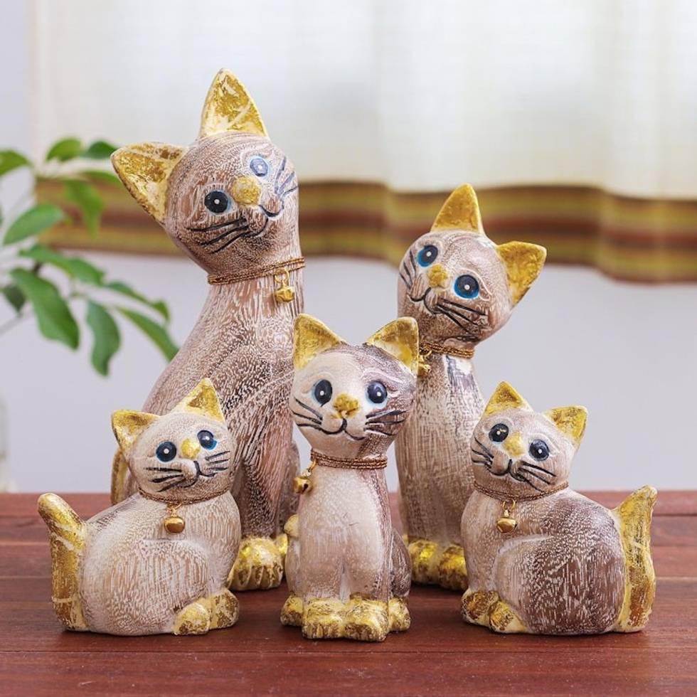 "Cats symbolize elegance, cunning and mystery. This set of five raintree wood sculptures features a cheeky family of cats with little aluminum bells. Hand-carved in Thailand by Moo and Aud, this family comes in colorful tones for a unique design."