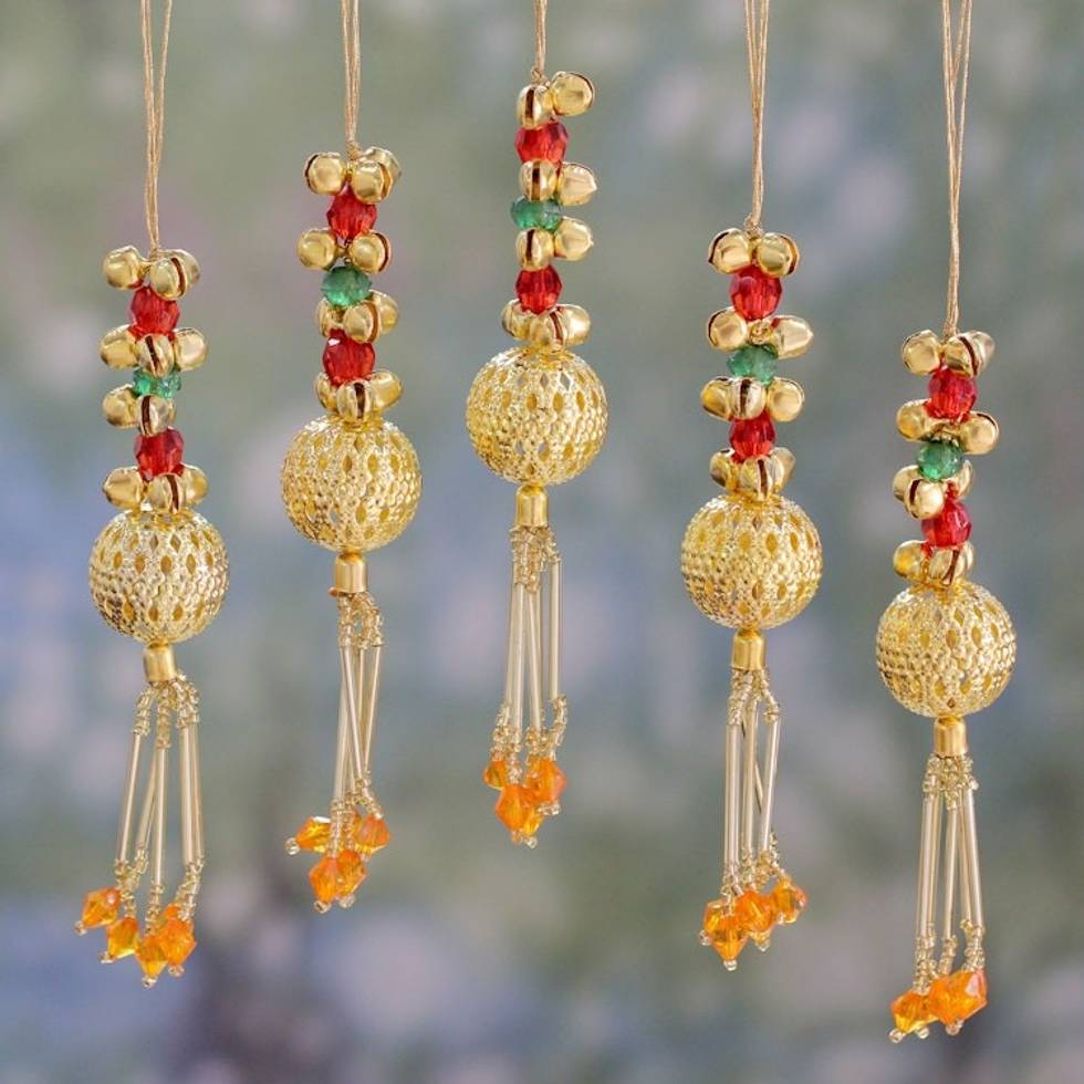 Set of 5 Handcrafted Beaded Brass Bell Christmas Ornaments 'Jingle Bells' Item ID: 2669892238