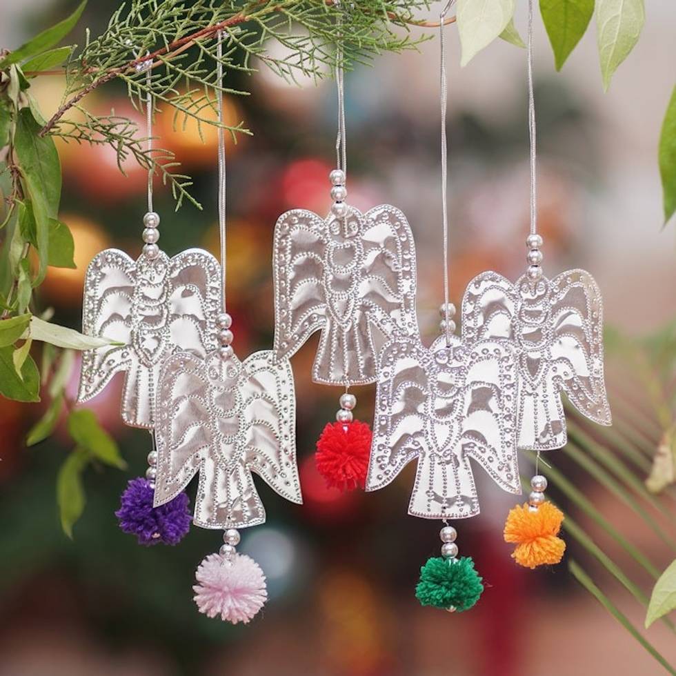 Set of 5 Handcrafted Embossed Angel Ornaments with Pompoms 'Angelic Sparkles' Item ID: 2671763008