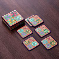 Set of 6 Floral Painted Orange Papier Mache Coasters 'Summer Elixir' Item ID: 2671782194