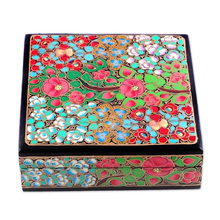 This box is one of three very lovely and beautifully decorated boxes I have from this artisan. "Cheerful Flare" is painted in flowers that represent the flowers of the Kashmir Valley in India. It has many beautiful colors, including red, rose, orange, green and purple! A very pretty box.