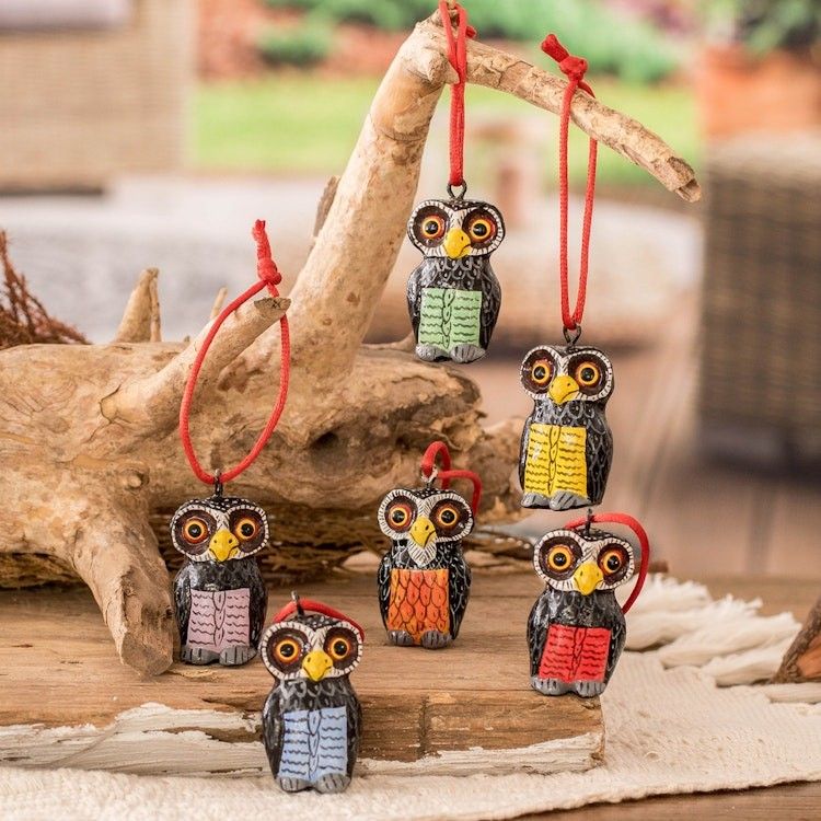 "Bring a playful touch to your holiday decor with this set of six ceramic owl ornaments, handcrafted with care and painted in vibrant hues. Each owl, shaped and detailed by Pedro Apop in Guatemala, hangs from a red cord, ready to brighten your tree or any space year-round with its cheerful charm."