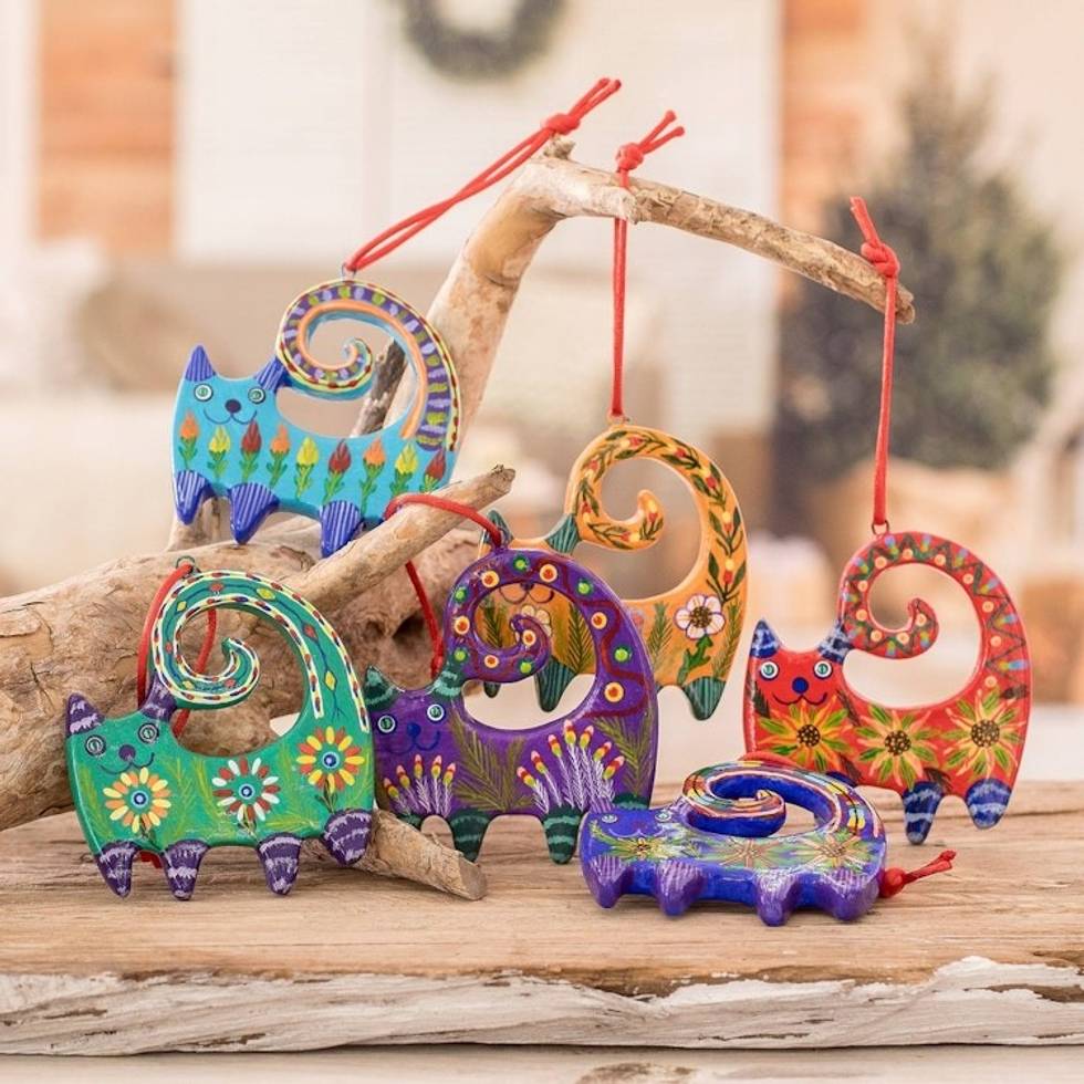The artist really captures the frisky feline facial expressions cat lovers know so well. I love the bright colors and rustic charm of these ornaments. Great find!