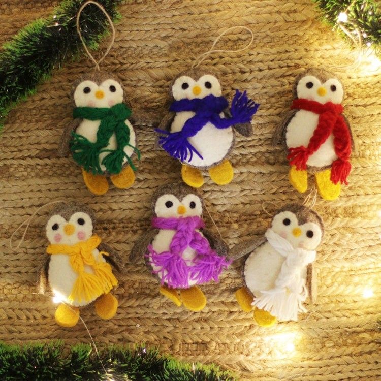 "The North Pole celebrates Christmas with you by sending this cute group of penguin friends. Pramod Panwar of India draws inspiration from holiday traditions to create this adorable set of six wool felt ornaments, depicting each penguin with a scarf in a unique hue for a fun touch. Each little accessory has a jute cord for easy use, and they all come in a storage bag."