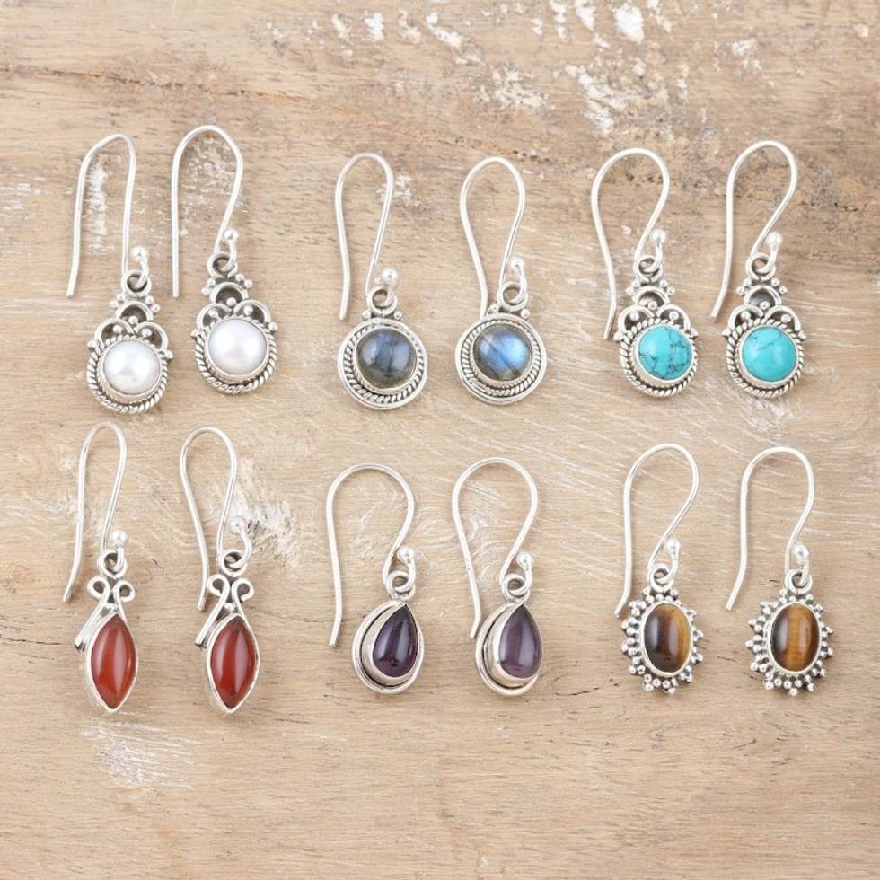 Set of 6 Sterling Silver Gemstone Dangle Earrings from India 'Everyday Gems' Item ID: 2669924448
