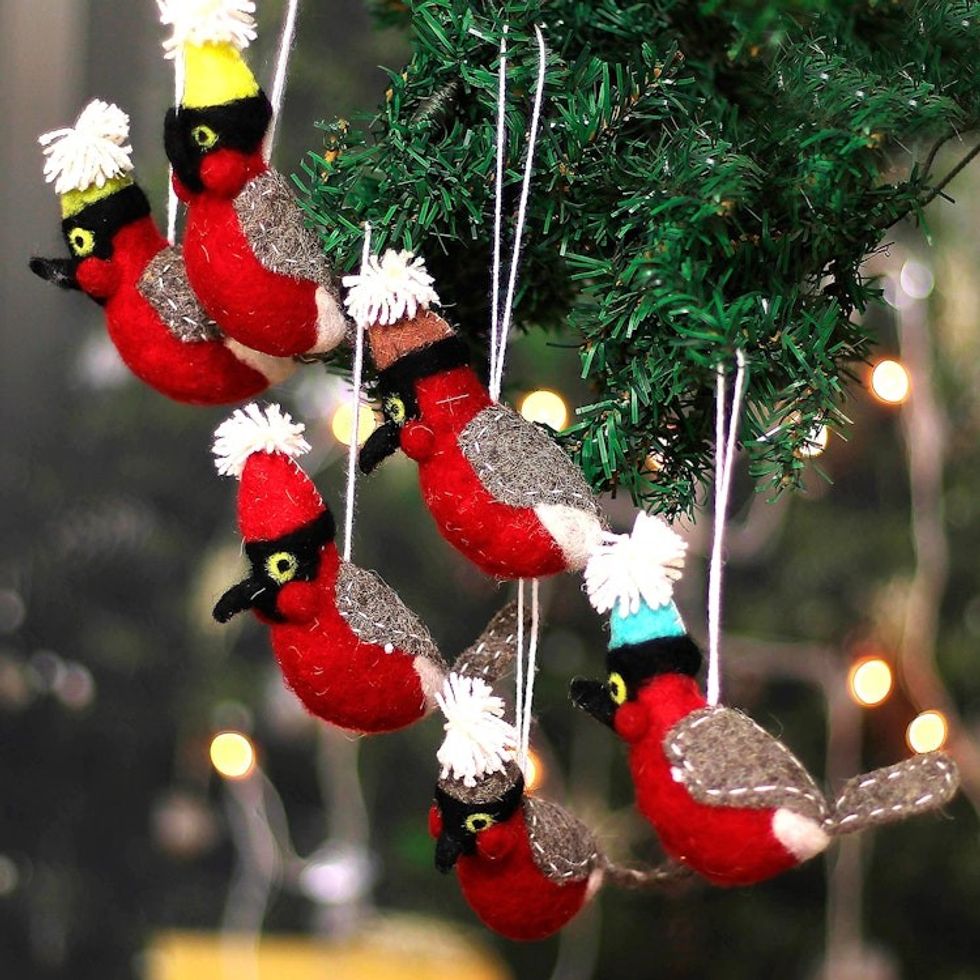 Set of 6 Wool Felt Red Bird Ornaments Handcrafted in India 'Holiday Sonata' Item ID: 2669892293