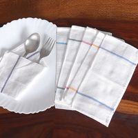 "Transport your meals and dinners to an ambiance of sweetness and joy with Indu and Chitra's newest design. Handwoven from 100% cotton yarns, this set of six mini dish towels—directly from India—features a glorious white base hue accented with colorful stripes evoking the rainbow's enchanting hues."